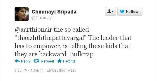 வாழ்வாதார உரிமைகளுக்கும் இட ஒதுக்கீட்டுக்கும் எதிரான சின்மயியின்